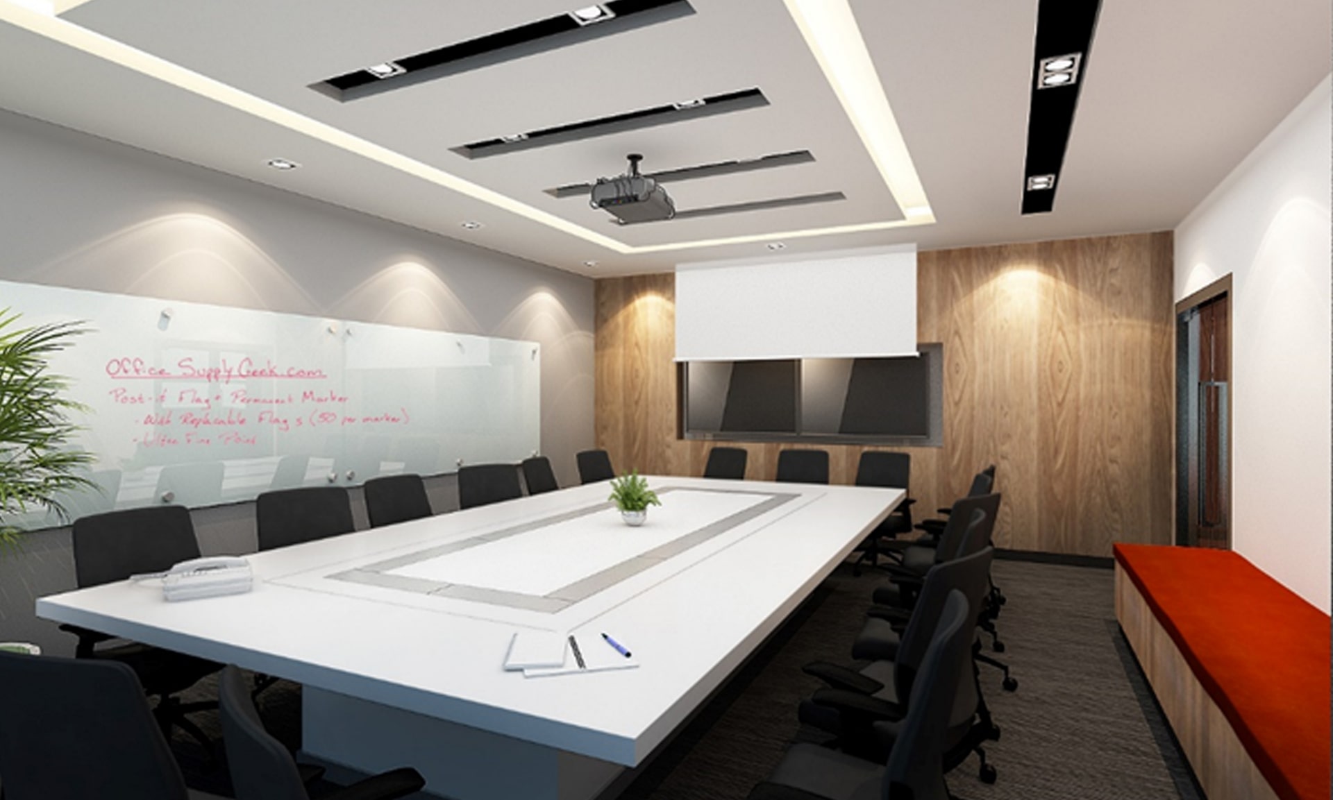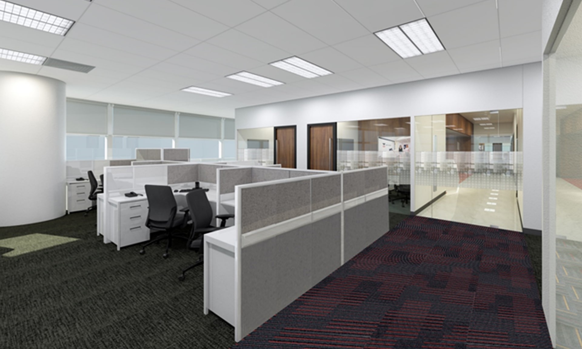 Our design for this space uses contrasting tones with a highlight of red to fit the brand colours of the company and to create a space that is fit for productivity.